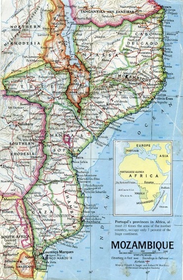 | Os capitães de Portugal do comércio da Índia lançaram olhos especulativos em terra, ao circundarem a pouco conhecida África nos séculos XV e XVI. A busca por comida e água logo se transformou em busca por ouro e comércio, e os postos de comércio expandiram-se para o interior. Hoje a bandeira de Portugal ainda está desfraldade em Moçambique, a segunda maior (depois de Angola) das suas províncias africanas. A planície costeira da África Oriental, coberta de mato, estende-se para norte até montanhas de 2400 metros e sobe para oeste até ao planalto. O Zambeze, o quarto rio mais longo de África, divide o país ao meio. A agricultura prospera ao longo dos rios Zambeze, Save, e Limpopo mais abaixo. No interior vivem tribos cujos hábitos pouco mudaram desde que o missionário escocês Dr. David Livingstone explorou a área há mais de um século. NOME OFICIAL: Moçambique, África Oriental Portuguesa; ÁREA: 783.000 quilómetros quadrados; POPULAÇÃO: 6.650.000; LÍNGUA: Português, várias línguas Bantu, Swahili costeiro; RELIGIÃO: Católica Romana, muçulmana, pagã; ECONOMIA: Agrícola – algodão, açúcar, castanha de caju, chá, sisal, óleos vegetais, côco, algum carvão mineiro, cobre, berílio, outros minerais; CIDADES: Lourenço Marques (184,000 incl. subúrbios), capital e principal porto; Beira (81.000), segunda maior, importante porto, início/fim via férrea; CLIMA: um pouco como a Flórida, as estações são marcadas por um período chuvoso (novembro-março) e outro seco (abril-outubro). |