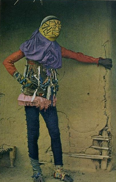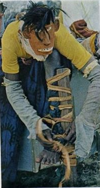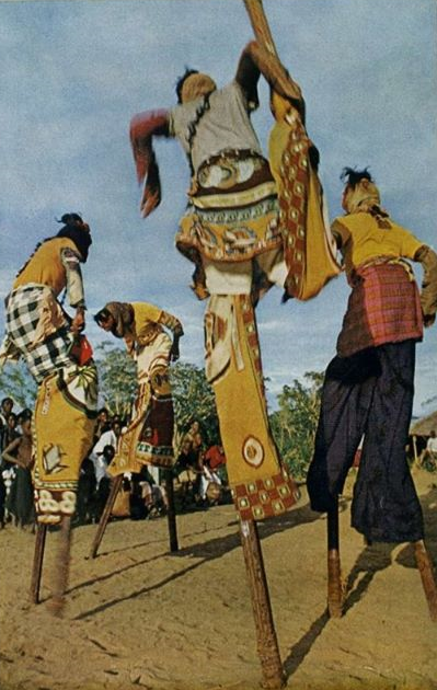 As pernas de pau que montavam eram diferentes daquelas que conheci quando criança; não tinham apoios para os pés. As extremidades superiores dos postes de 2 metros eram amarradas firmemente às pernas com fortes fibras de tecido. Panos vermelhos e amarelos, como calças compridas e largas, cobriam as pernas de pau. Máscaras grotescas cobriam os rostos.