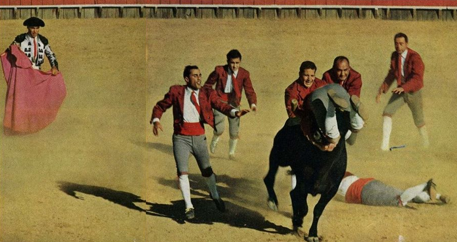 Cartazes anunciavam uma tourada, com matadores portugueses. Publicidade ilustrava vivamente a ousadia suicida dos forcados, que saltam entre os chifres dos touros em investida e se seguram para salvar a vida (abaixo).
