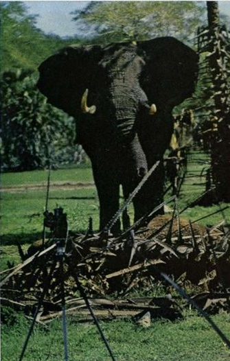 Um deles avançou para nós. Inesperadamente, rodou, pelo menos quatro toneladas dele. Com as orelhas abertas e o tronco levantado, gritou e veio em nossa direção a passos gigantescos (acima, ao lado).