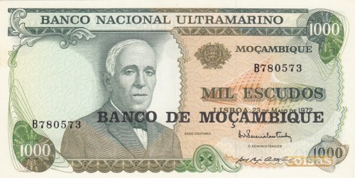 A nota de 1000 escudos, do Banco Nacional Ultramarino, para circulação em Moçambique, de 1972.